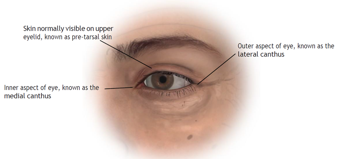 The youthful upper eyelid is characterised by a clearly visible strip of eyelid skin directly above the eyelashes. This is known as the pre-tarsal skin (so called because lying beneath the skin is a structure called the tarsal plate made out of tissue similar to cartilage, which gives the margin of the eyelid substance). The upper boundary of this area of skin is called the supra tarsal crease (it is formed by fine ligaments running from the top of the tarsal plate into the eyelid skin) above which the skin continues up to the eyebrow in a slightly con- cave fashion. The inner and outer margins of the eye (where the medial and lateral margins of the upper and lower tarsal plates attach into the bone of the orbit) are called the medial canthus and lateral canthus